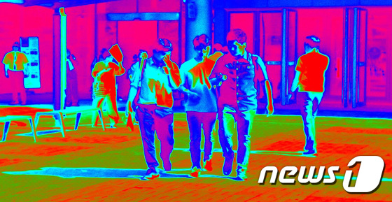 | 폭염이 계속되는 대전 한 거리에서 열화상 카메라로 촬영한 도심 일대가 붉게 표시되고 있다. 온도가 높을수록 붉은색, 낮을수록 푸른색으로 표시된다./뉴스1 © News1 주기철 기자 |